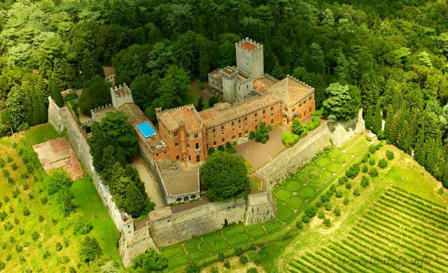 Предстои ни да посетим средновековен замък с огромно прилежащо имение. Сградата съществува от 12-и век, разположена е в граничните земи между Флоренция и Сиена, устояла на многобройните противоборства между двете кралства, испанско нашествие през 15-и век и дори бомбардировките от Втората световна война. Реконструиран няколко пъти през този дълъг период, по уникален начин съчетава в себе си средновековна и романтична архитектура с готически елементи. Прилежащото му имение е с 230 хектара с маслинови и дъбови горички и големи лозови насаждения.