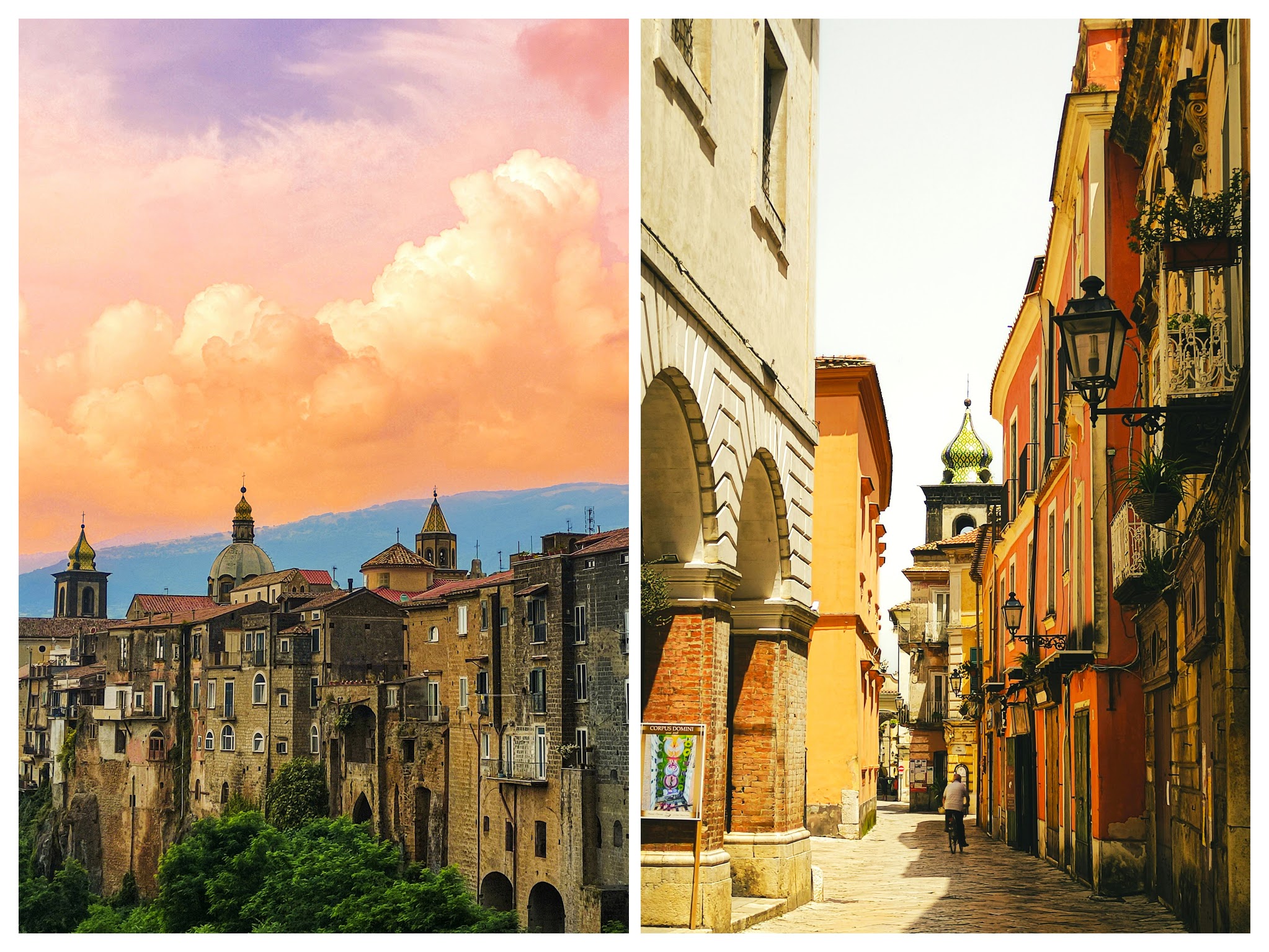 Санта Агата .. „Изненада“ е думата, която ѝ отива .. Къщите „изникват“ направо от скалната туфа като гъби и се подреждат плътно една до друга в сладка прегръдка, следвайки общата архитектура в своето различие, създават невъобразим релеф, допълнен от куполите на църквите и камбанариите на манастирите .. По италиански пленително, градчето ни предлага да опитаме типичните равиоли с наденички, сирене „проволоне“ и .. местния сорт ябълка върху сос от нахут .. Не липсва и чудесно вино, облагородено от южното слънце и морския повей ..